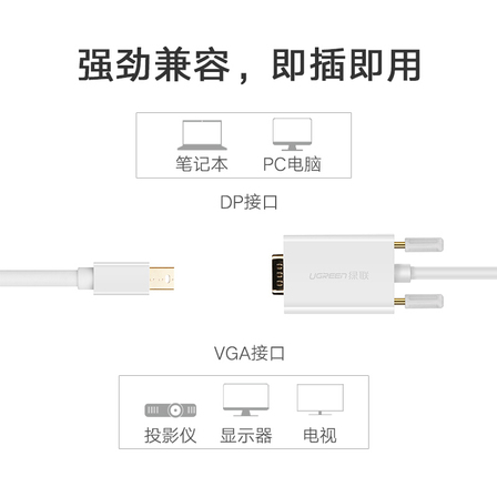 全新设备 全新 绿联(UGREEN)Mini DP转VGA转接线 高清雷电转换器 适用苹果微软Surface笔记本接显示器投影仪1.5米 白色 10410